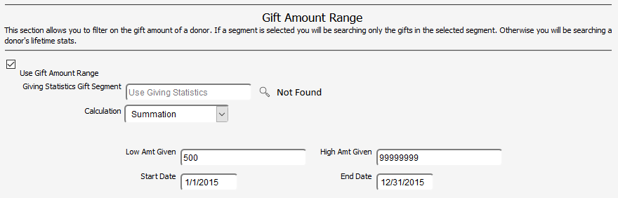 This is probably the most used filter. Click the ‘Use Gift Amount Range’ check box. That will give you two fields. We’ll skip the gift segment field for now and move to Calculation. Let’s say that you want to get a list of names who have given more than $500 in a date range and you want to add up their gifts to see if the total of all gifts in that range are more than $500. For that we can choose Summation here. That opens to more sets of fields. Put 500 in the Low Amt Given field and 9999999 in the High Amount field. In the Start and End Date fields, enter a date range. (Always use the 4 digit year when entering dates in Denari.) Now when you run the name segment Denari will add up the donor’s gifts in that date range and give you anyone who gave between 500 and infinity, or more than 500.